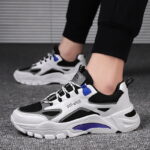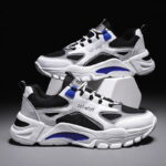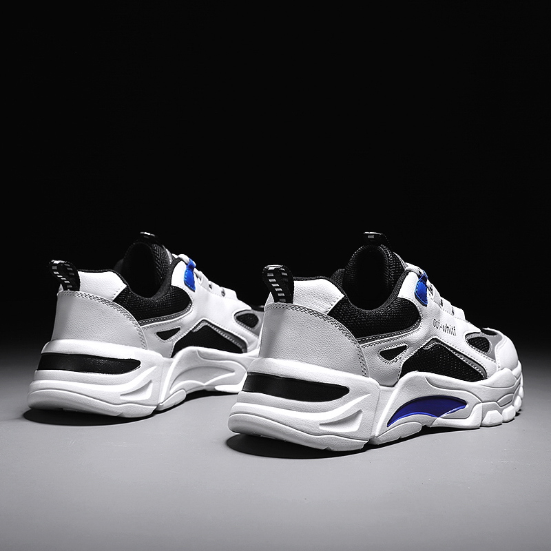 These trendy chunky sneakers feature a bold black-and-white color combination with striking blue accents, delivering a modern urban fashion vibe. Made with high-quality breathable mesh and synthetic leather materials, the upper ensures dry, comfortable wear while maintaining durability. The thick rubber outsole provides excellent anti-slip performance and cushioning, offering stable support and comfort for walking or sports activities. Perfect for daily commutes, workouts, or street-style fashion, these sneakers are the ideal choice for those seeking both style and functionality.