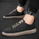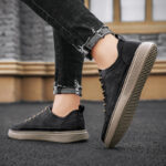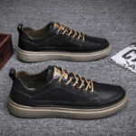 These black leather casual shoes combine elegance and functionality, featuring a classic design and refined materials, making them perfect for daily commutes and casual occasions. The premium synthetic leather upper delivers a smooth texture, is easy to clean, and offers long-lasting durability. Brown lace accents add a vintage touch, perfectly complementing the earth-tone outsole. The minimalist yet stylish design is paired with a lightweight, high-elastic sole for excellent cushioning and long-term comfort.