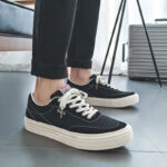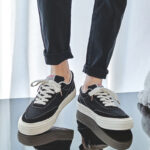 These black and white classic canvas sneakers are inspired by minimalist vintage style, making them a timeless fashion staple. The upper is crafted from high-quality black canvas material with white stitching details, showcasing refined craftsmanship and texture. The white rubber outsole not only enhances slip resistance and durability but also adds a fresh and clean aesthetic to the design. Wide white laces and a reinforced toe cap provide both style and functionality, ensuring comfort and stability during wear. The soft, breathable inner lining keeps your feet relaxed, even during long hours of use. Perfectly versatile, these sneakers pair effortlessly with jeans, casual outfits, or streetwear, making them ideal for daily commutes, casual outings, and various occasions.