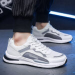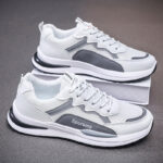 These gray and white sneakers perfectly combine classic color tones with modern design, offering a sleek yet trendy style. The upper is crafted from high-quality mesh and synthetic leather, ensuring breathability and durability, making it ideal for daily commutes or casual wear. The lightweight sole provides excellent cushioning and traction, delivering a comfortable walking experience.