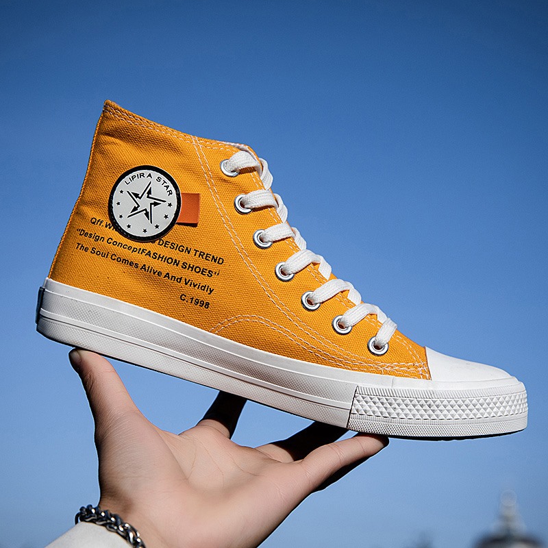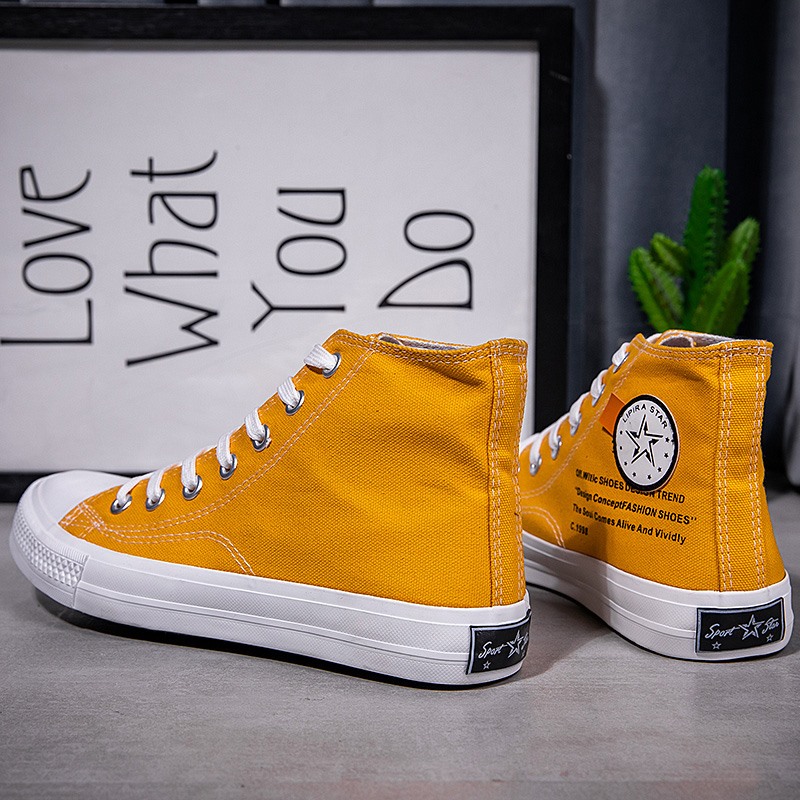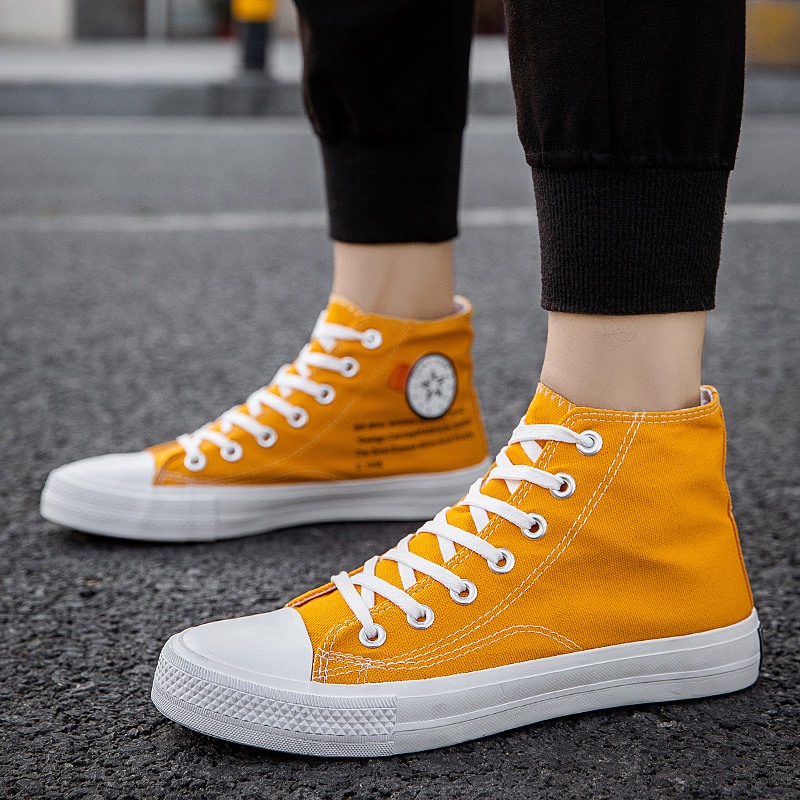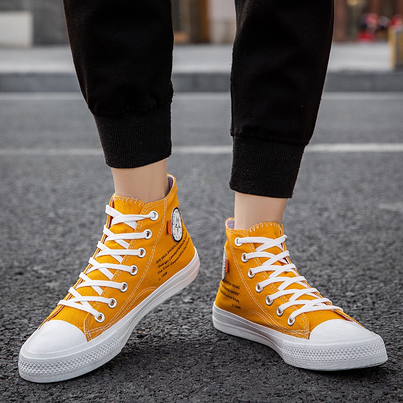 These vibrant yellow high-top canvas shoes combine style and comfort, making them a must-have for fashion enthusiasts. Crafted from high-quality canvas, the upper provides excellent breathability for long-lasting comfort. The classic high-top design not only offers extra ankle support but also adds a pop of lively color to your overall outfit. Featuring a durable, non-slip rubber sole, these shoes are perfect for daily wear or outdoor activities. Whether paired with jeans or casual shorts, this pair effortlessly complements any occasion, showcasing your unique personality.