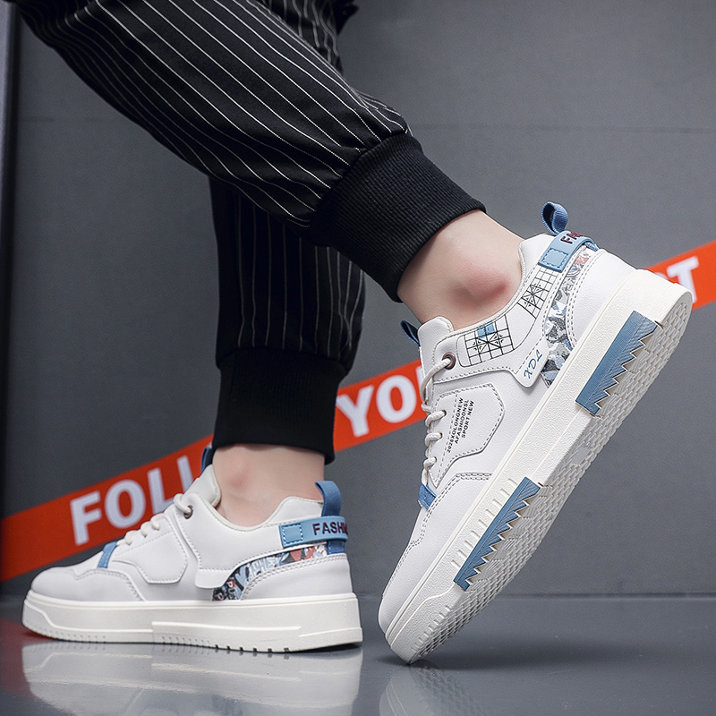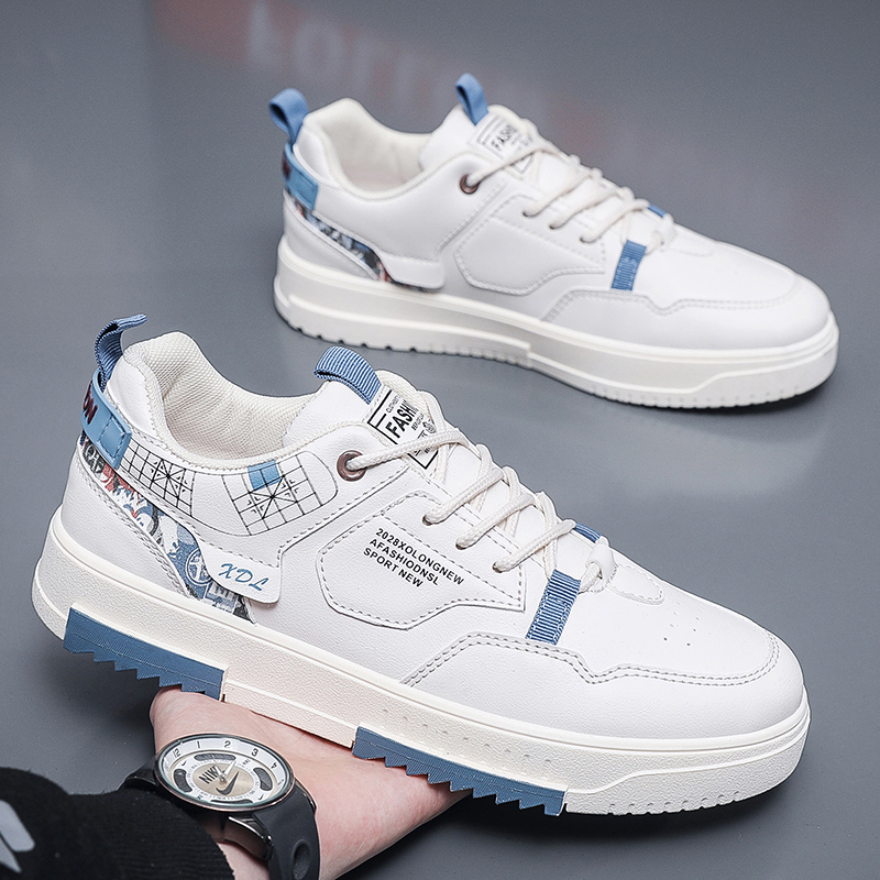 These trendy casual sneakers feature a classic white base accented with refreshing blue panels and geometric line details, delivering a modern and stylish design. Crafted with premium synthetic leather, the upper is soft, breathable, and easy to maintain. Paired with a durable, anti-slip rubber outsole, these shoes ensure confident strides and all-day comfort for any occasion.