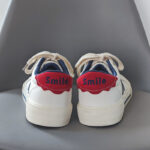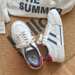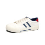 - Classic Color Combination: White base with blue stripes and a red heel for a simple yet fashionable design.