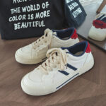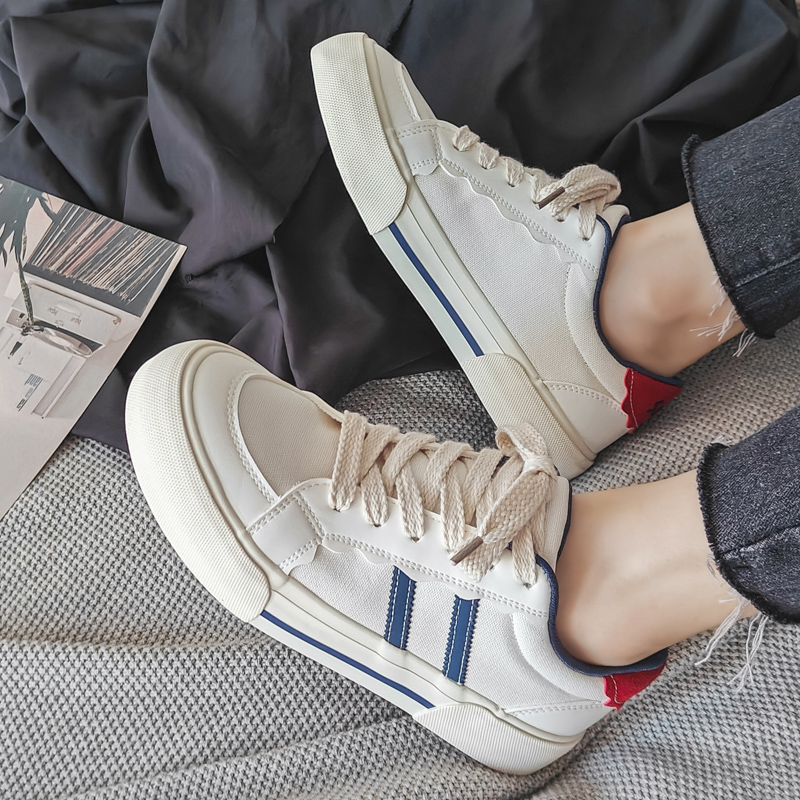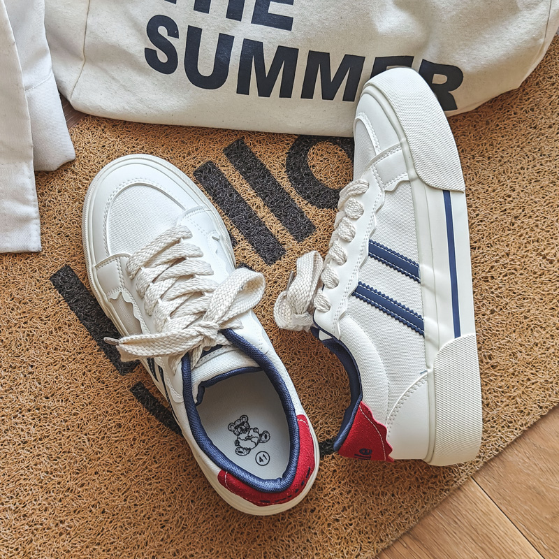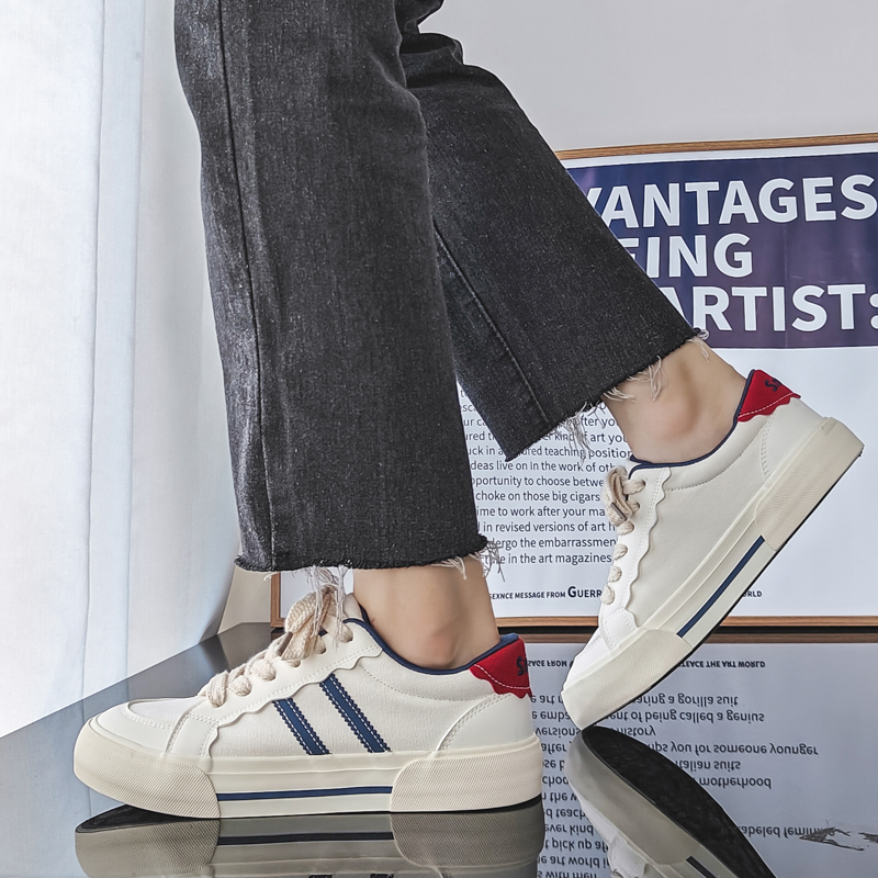 These trendy casual sneakers feature a clean white base with blue stripes and a bold red heel accent, delivering a sleek yet stylish visual appeal. Made with high-quality canvas and synthetic leather materials, the upper is soft, breathable, and durable for long-lasting comfort. The thick anti-slip rubber sole ensures excellent grip and wear resistance, keeping your steps steady. Perfect for street fashion, daily commutes, or casual outings, these sneakers are your go-to choice for a stylish look.