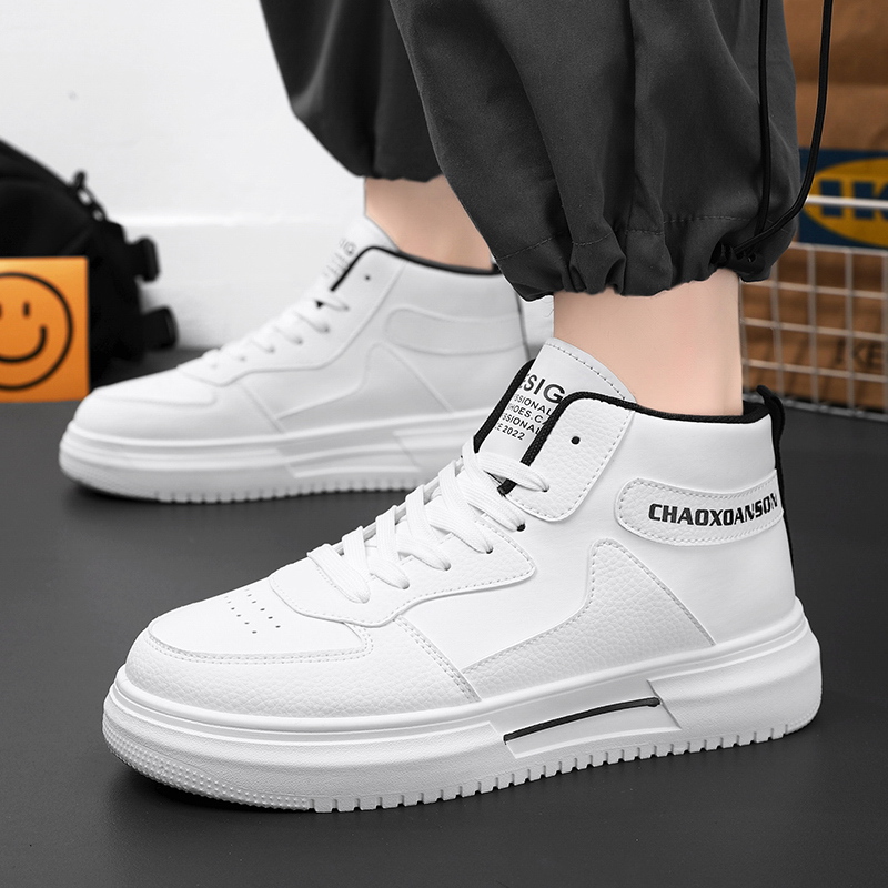 These pure white and white high-top sneakers combine fashion and functionality, making them the perfect fit for everyday wear and trendy street style. The upper is crafted from high-quality synthetic leather, presenting a sleek and premium texture. Paired with a durable thick sole, these shoes provide excellent grip and support for all-day comfort. The classic lace-up design ensures a secure fit, while the unique brand print on the side adds a touch of style. Whether for casual outings, campus commutes, or trendy streetwear looks, these high-top sneakers are your ideal choice!