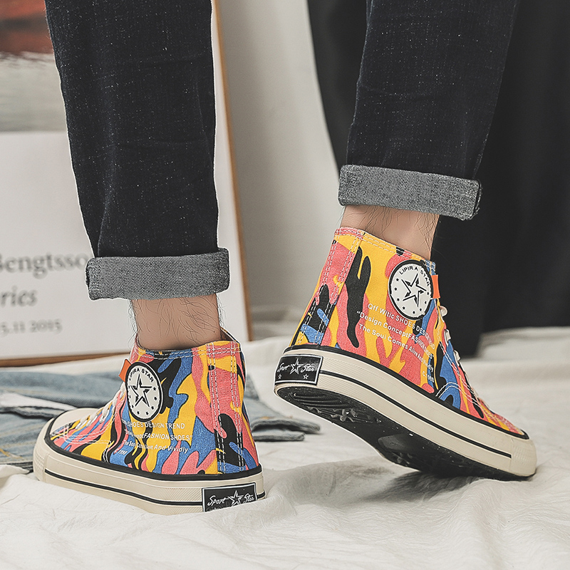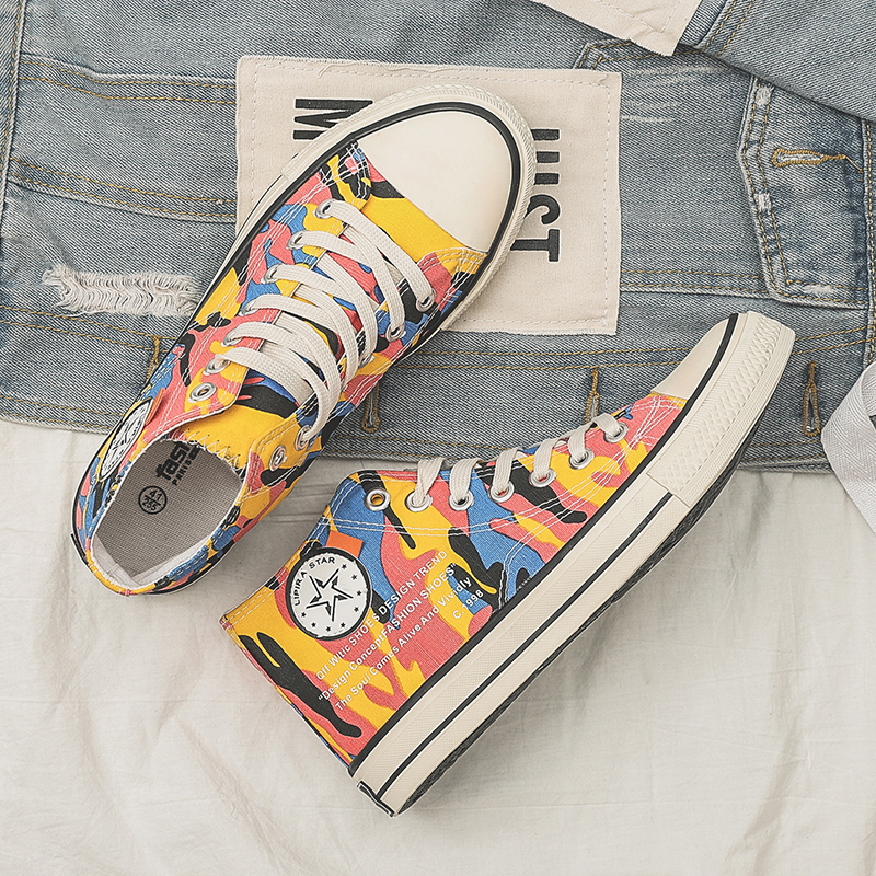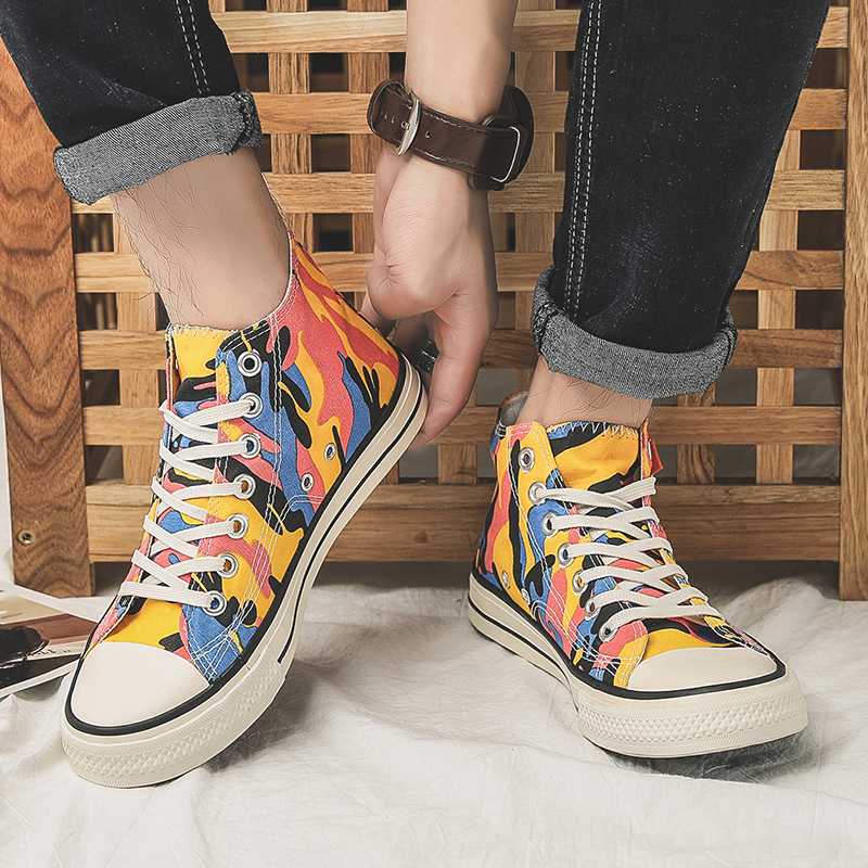 This pair of high-top canvas shoes features a vibrant color-block camouflage design, perfectly combining style and comfort. Made with premium canvas, the upper is breathable and durable, ensuring all-day comfort. The rubber sole offers excellent slip resistance, making it suitable for both daily wear and outdoor activities. The bright colors and unique patterns add a pop of style, ideal for consumers seeking a personalized look. These canvas shoes pair effortlessly with jeans, shorts, or skirts, showcasing a trendy and distinctive charm, making them an excellent choice for your everyday outfits.