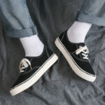 These low-top black canvas shoes feature a minimalist design, combining a classic black upper with white laces and detailed stitching, perfectly blending fashion and retro style. The upper is crafted from high-quality canvas material, ensuring breathability and lightweight comfort for all-day wear. The sturdy rubber outsole is durable, anti-slip, and provides excellent foot support for stability with every step. Whether for casual wear, campus style, or street fashion, these canvas shoes effortlessly match any outfit, making them a must-have wardrobe essential.