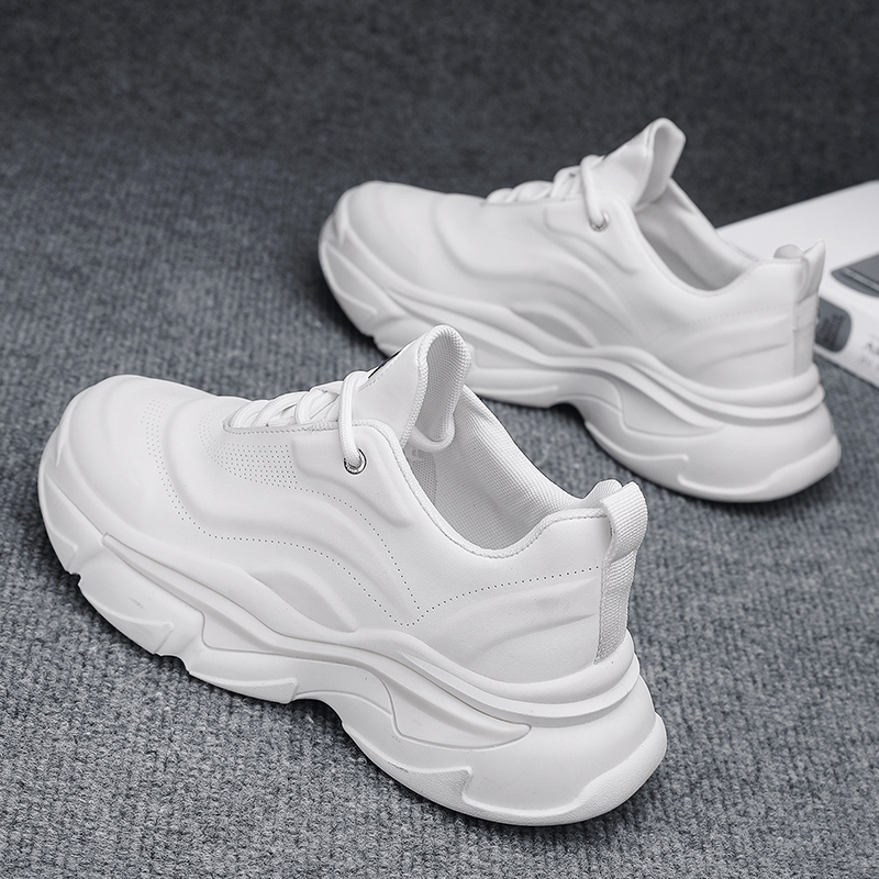These all-white chunky sneakers stand out with their sleek and minimalistic design, perfectly blending modern trends with ultimate comfort. The upper is crafted from high-quality breathable materials, featuring smooth, streamlined lines that ensure all-day wearability without discomfort. The thick rubber sole provides excellent grip and stability while subtly elongating the legs for a stylish height-boosting effect. Whether for casual streetwear or everyday outings, these versatile sneakers are a must-have, combining lightweight comfort with effortless style to showcase your confidence anywhere, anytime!