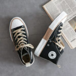 These vintage high-top canvas shoes feature a classic black base accented with beige laces and brown details, offering a stylish retro vibe. The upper is crafted from premium canvas material, providing breathable comfort and durability for all-day wear. The thick rubber outsole ensures excellent stability, grip, and wear resistance, while the signature-style design adds a unique touch. The high-top construction offers both warmth and style, making these shoes perfect for pairing with jeans, casual pants, and more. Ideal for daily wear and street fashion, they’re a must-have for any wardrobe.